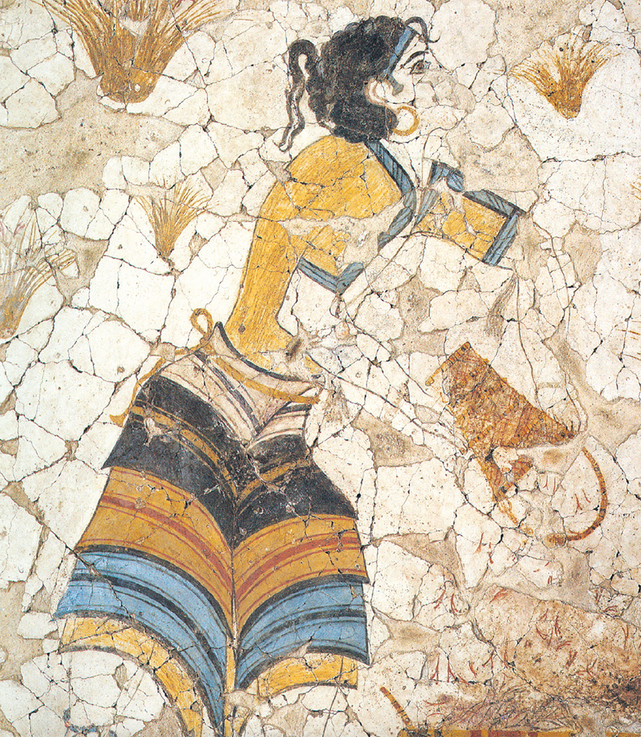 Lo zafferano, la più sacra tra le erbe medicinali indiane, è “parte integrante di molte cerimonie indù e buddiste, visto che il segno (striscia) caratteristico sulla fronte è spesso preparato con lo zafferano” (Buhner, 219). Le donne delle Isole greche sono state splendidamente raffigurate negli affreschi dell’Età del bronzo, che le mostrano mentre raccolgono e lavorano lo zafferano dalla pianta del crocus, mentre offrono lo zafferano alla loro sacerdotessa o dea seduta sul trono in posizione centrale, e mentre si dipingono tatuaggi con questa sostanza ed indossano vesti tinte con lo stesso colore dorato dello zafferano, più tardi indossate dai monaci buddisti e dai sadhu indiani (uomini e donne santi)…