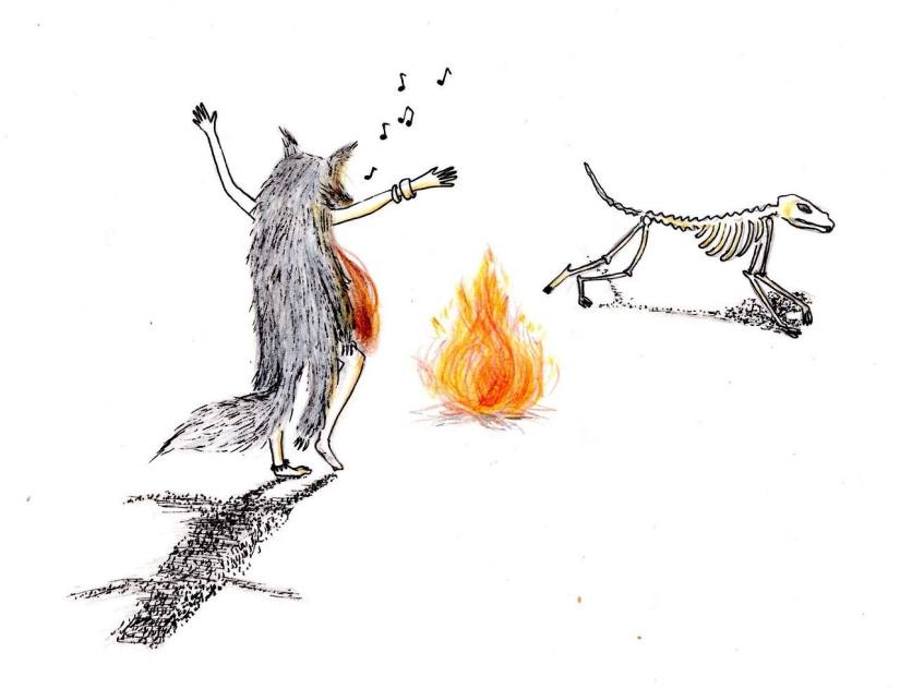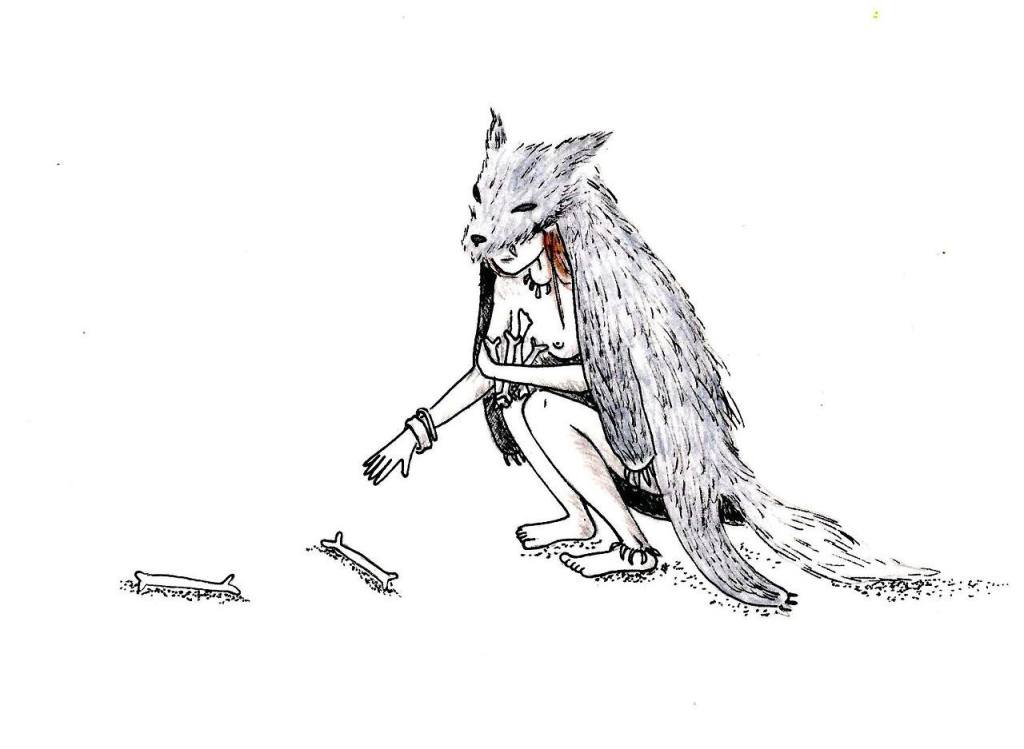 Striscia e setaccia le montagne e i letti prosciugati dei fiumi, alla ricerca di ossa di lupo, e quando ha riunito un intero scheletro, quando l’ultimo osso è al suo posto e la bella scultura bianca della creatura sta davanti a lei, allora siede accanto al fuoco e pensa quale canzone cantare.